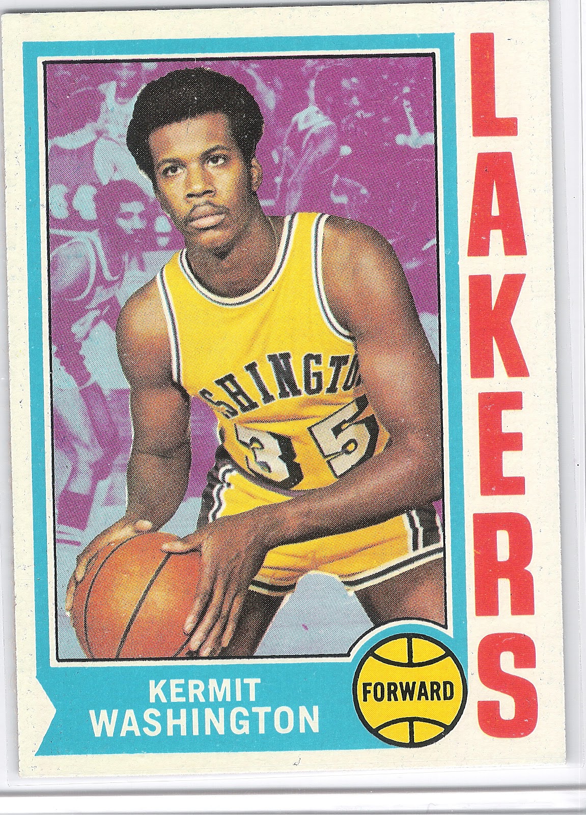 Before that incident Kermit looked to have a bright future in the NBA - earning All American honors while at American and a first round selection by the Lakers in the 1973 draft. As you can see from the back of Kermit's rookie card, he became the 7th player in NCAA history to average 20 points and 20 rebounds for his collegiate career, joining Dr. J, Bill Russell, Artis Gilmore and Elgin Baylor. In fact, he needed 39 points in his last college game to accomplish the 20/20 average - and he scored 40.